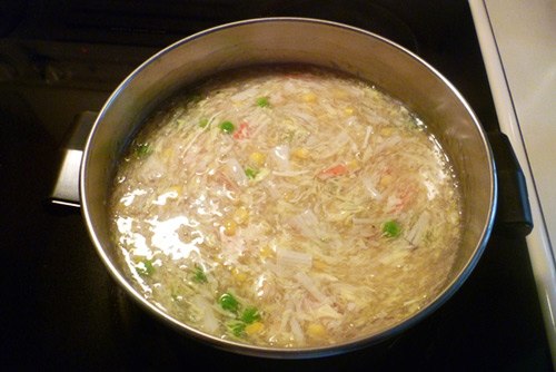 – Bắc nồi nước dùng lên bếp đun sôi với lửa vừa, sau đó cho lần lượt tôm, cua, thịt giả cua, ngô hạt, đậu hà lan vào nấu chín, nêm muối và hạt nêm cho vừa ăn.