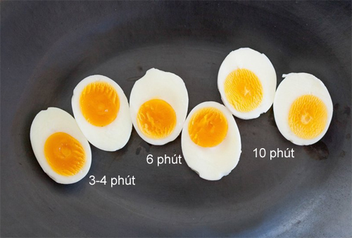 - 10 phút: Lòng trắng rắn, lòng đỏ đã đông lại, nhưng vẫn còn mềm, khi ăn thì bở và bùi.