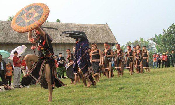 Đồng bào diễn xướng xoang và cồng chiêng quanh cây nêu. Ảnh: vinaculto