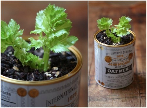 Bạn di dời thân cần tây vào một lon kim loại đã hết dùng có đựng đất.